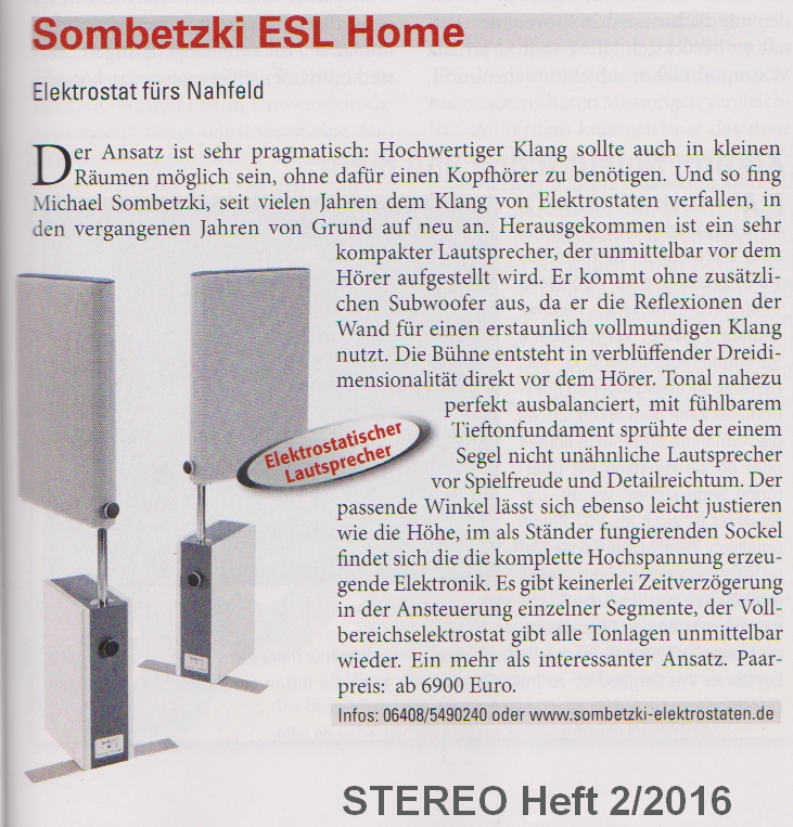 " Die Sombetzki Home ESL sind nicht nur eine Lösung für problematische oder gar nicht vorhandene Hörräume, sondern auch einmalige Schallwandler, die die Vorzüge von Elektrostaten und guten Kopfhörern auf faszinierende Art verbinden. "