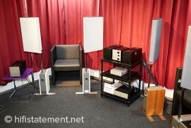 " Da bevorzugen wir doch beispielsweise eine neuartige Elektrostaten-Lösung von Sombetzki, die quasi eine neue Produktgattung zwischen Lautsprecher und Kopfhörer darstellt. Mittels schwenkbarer Panele gab es auf dem Hörsessel feinste Details und eine Auflösung wie vom Kopfhörer, aber verbunden mit dem Raumeindruck wie von Lautsprechern. Ob nun Nearfield-Monitoring oder nicht: Das ist etwas Neues mit Aha-Effekt! "