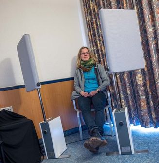 " Da bevorzugen wir doch beispielsweise eine neuartige Elektrostaten-Lösung von Sombetzki, die quasi eine neue Produktgattung zwischen Lautsprecher und Kopfhörer darstellt. Mittels schwenkbarer Panele gab es auf dem Hörsessel feinste Details und eine Auflösung wie vom Kopfhörer, aber verbunden mit dem Raumeindruck wie von Lautsprechern. Ob nun Nearfield-Monitoring oder nicht: Das ist etwas Neues mit Aha-Effekt! "