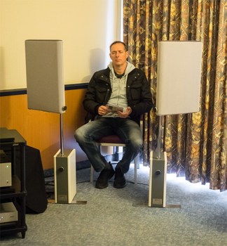 Der Meister selbst: Michael Sombetzki auf dem Hörplatz im perfekten Abstand zu seinen übergroßen Kopfhörern. Das ESL Home System kostet 7.500 Euro (Foto: H. Biermann) |