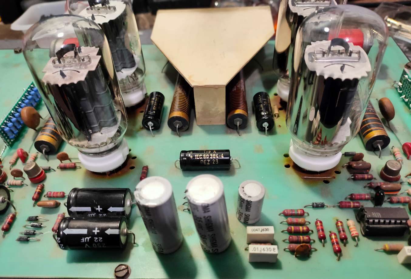 Die Röhren wurden ab Werk direkt in die Platinen (per Löthülsen) gesteckt. Dies führte im laufe der Jahre zu unsicheren Kontaktverbindungen. Wir bauen aktuell die passenden Sockel (Compactron) ein, da diese wieder lieferbar sind.